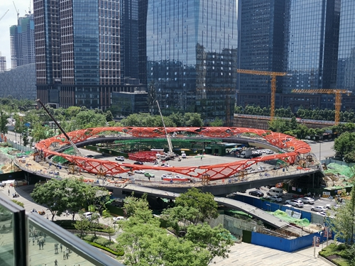 该项目位于成都市高新区益州大道路口,属交子金融大街形象提升工程中的重点项目。中国五冶集团主要承建该项目的钢结构制安部分,属异形空间结构,是整个施工环节技术含量最高,难度最大的部分。交子之环内直径90米,外直径110米,主要包括结构环、交通环和风雨环廊三部分,工程量约3500吨。