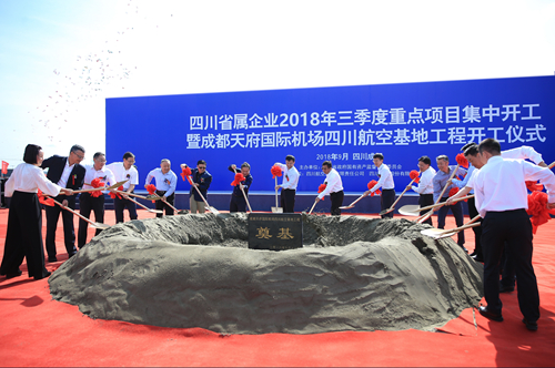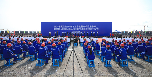 9月17日上午,四川省属国有企业2018年三季度重点项目集中开工仪式在中国五冶集团承建的成都新机场四川航空基地工程航空食品与货运施工总承包工程项目现场举行。四川省国资委副主任薛东兵,四川航空集团有限责任公司党委书记、董事长李海鹰,中国五冶集团董事长、党委书记程并强等有关领导出席开工仪式并致辞。集团公司副总经理张刚、营销总监曾松俊,一分公司、工程管理部、市场营销部有关负责人参加开工仪式。
